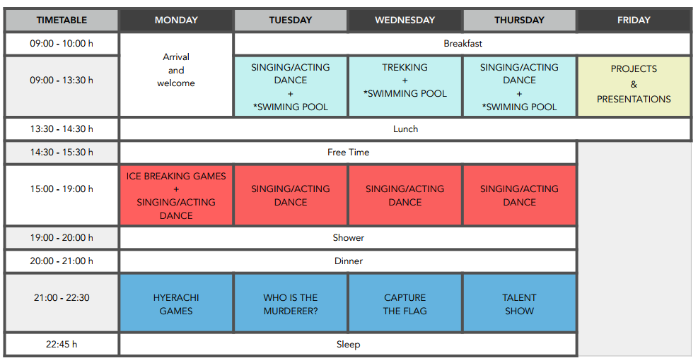 Nuestros monitores internacionales y los expertos en musical (canto, teatro y danza) combinarán el proyecto con algunas actividades lúdicas y deportivas.